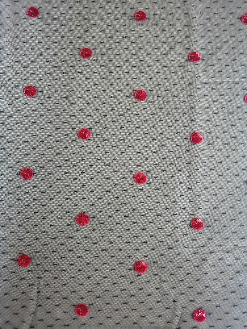 | ハイライト: | 黒く赤いポルカ ドットのスパンコールの生地,日の服の衣服のポルカ ドットのスパンコールの生地,皮の友好的なスパンコールの刺繍された生地 |