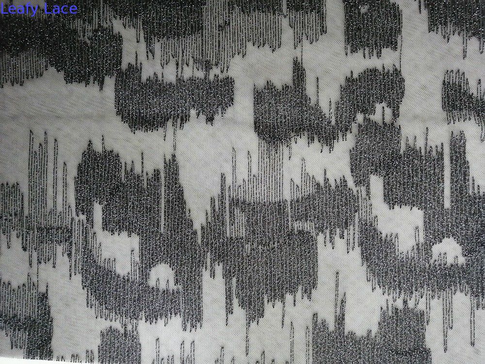 | ハイライト: | Lurexの銀製ヤーンはレースの生地を刺繍した,Lurexの銀製の刺繍されたレースの生地,幾何学的なライン金属レースの生地 |