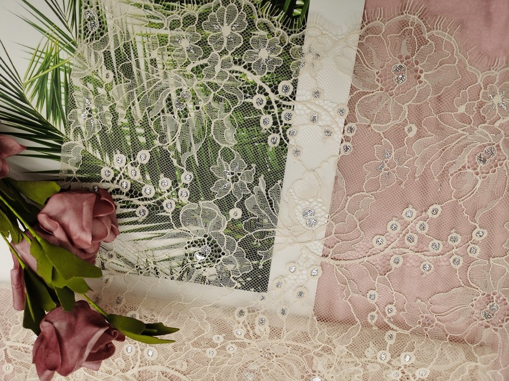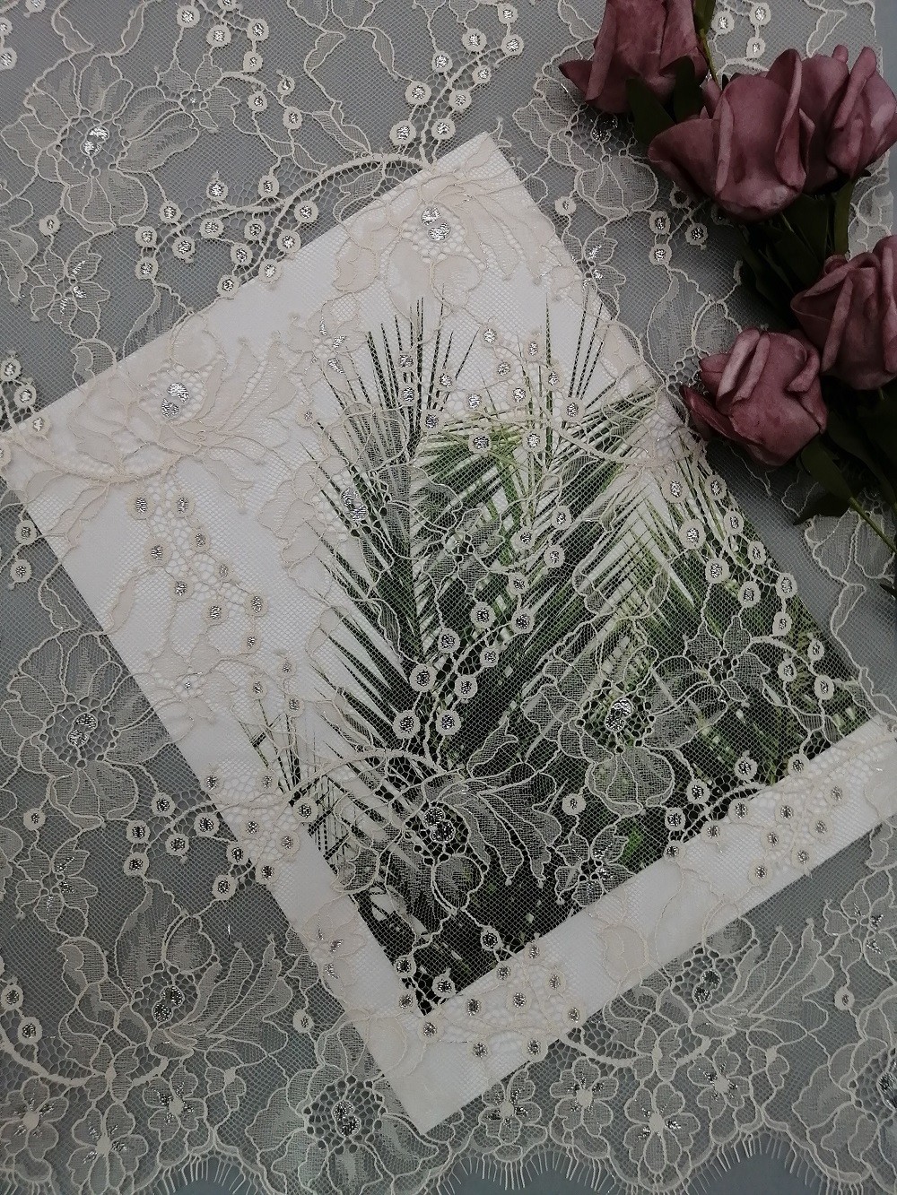ハイライト: | フランスのChantillyの金属銀製のレースの生地,145CMの金属銀製のレースの生地,Chantillyフランスの銀製のテュルの生地 |