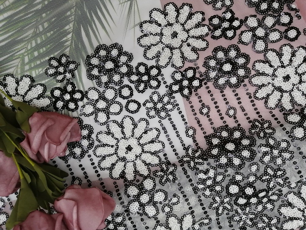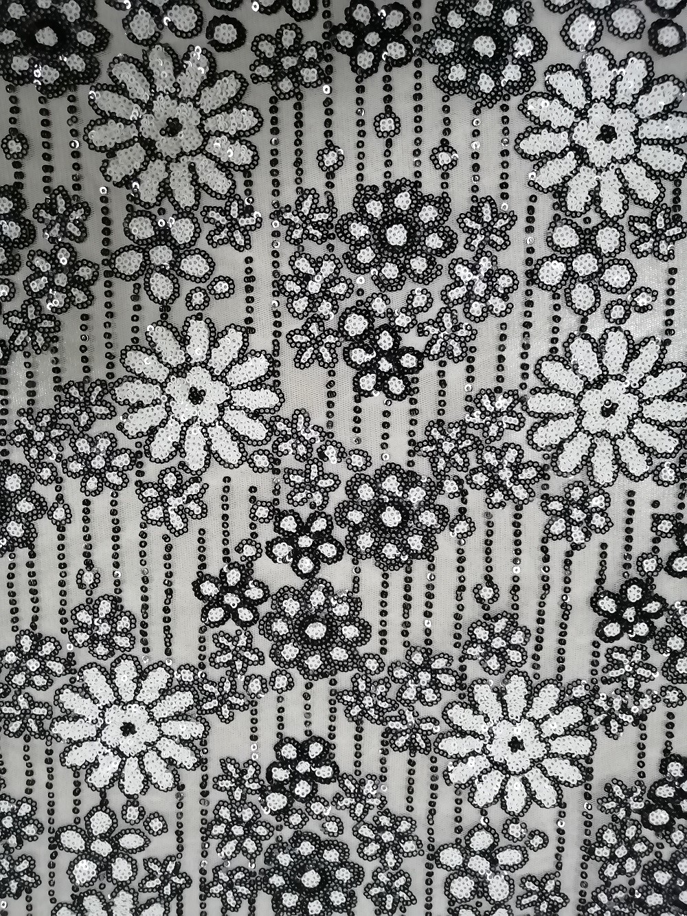 ハイライト: | 白く黒い対照のスパンコールの刺繍された生地,イブニング・ドレスのスパンコールの刺繍された生地,125cmの白黒スパンコールの生地 |