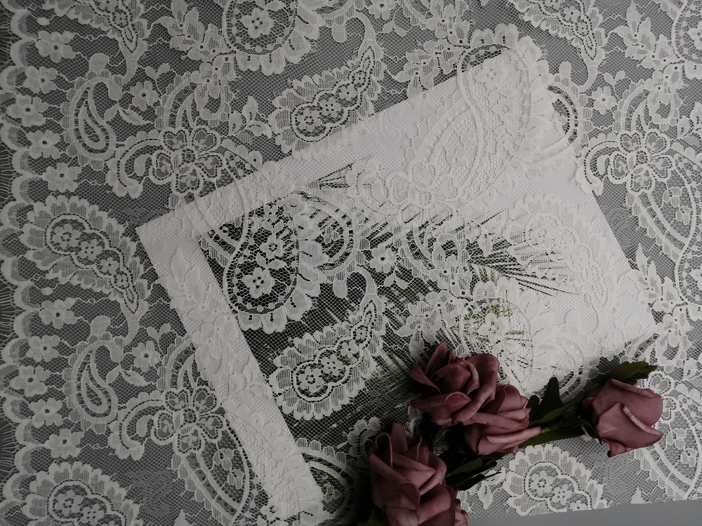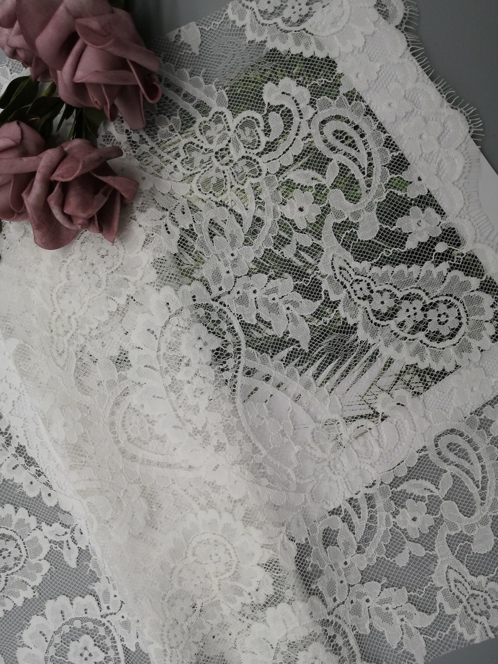 | ハイライト: | フランスのChantillyの花嫁のレースの生地,フランスのChantillyの白い花嫁のレースの生地,145cmのライト級選手のペーズリーのレースの生地 |