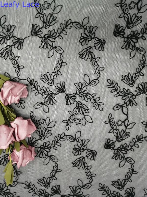 黒いレースの生地をくまなく花によって束ねられる刺繍はテュルの網に銀を着せるまたは女性は長く服の衣服の女の子の服、家の織物、カーテン、寝具の記事、服装、帽子、ウェディング ドレス、ブラウス、均一な人のワイシャツ、等のまわりを回る。
