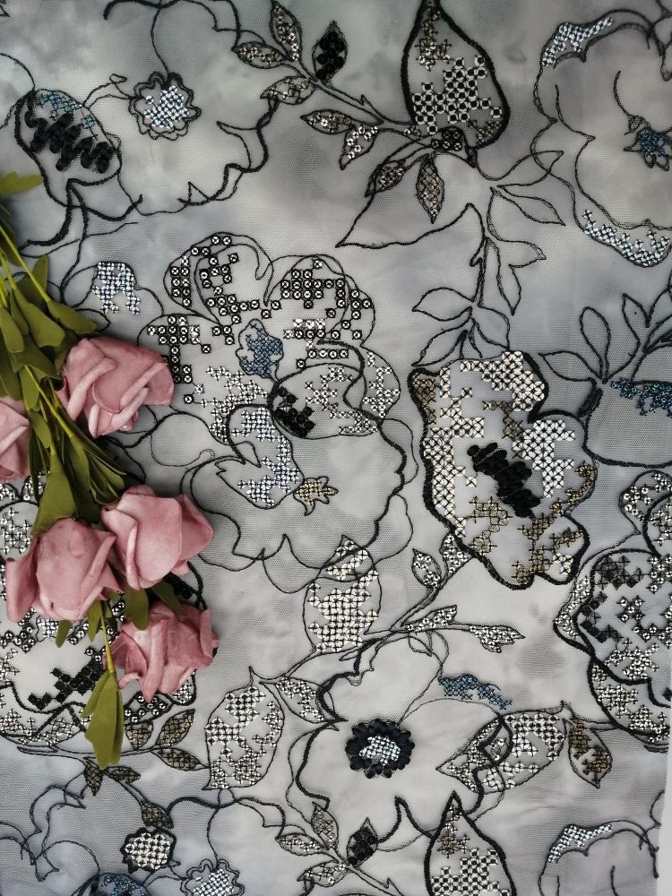 | ハイライト: | 125CMのスパンコールの刺繍された生地,網のスパンコールの刺繍された生地,OEKO TEXは花のレースを着色した |