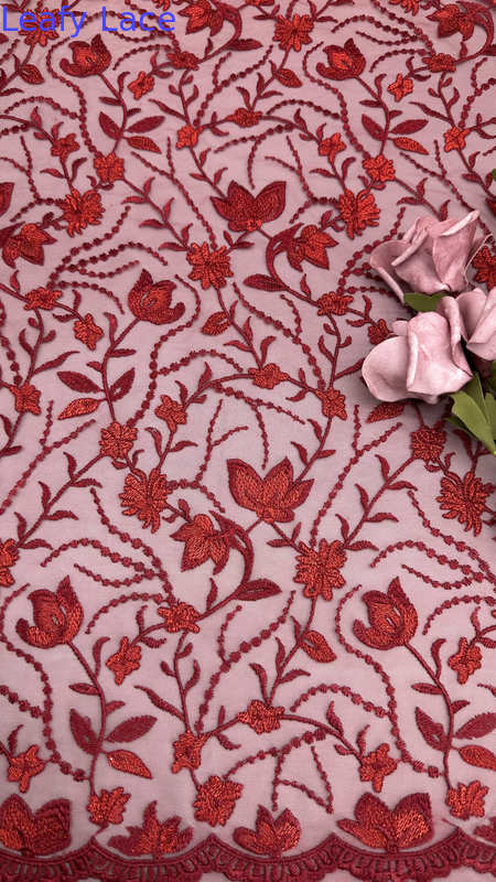 | ハイライト: | 赤色の刺繍レース生地,葉っぱの刺繍レース生地,メッシュで刺さった蕾の布 |