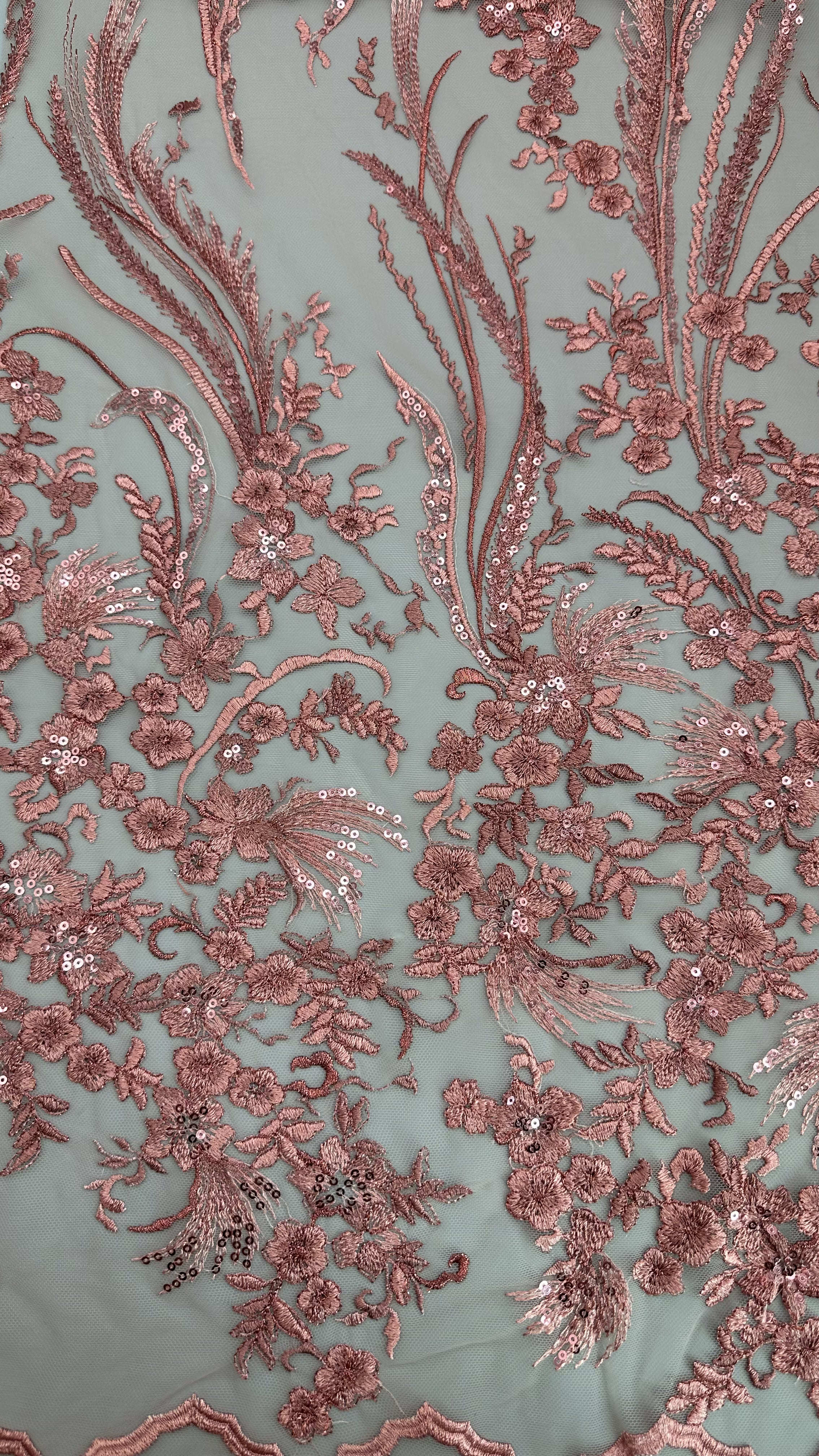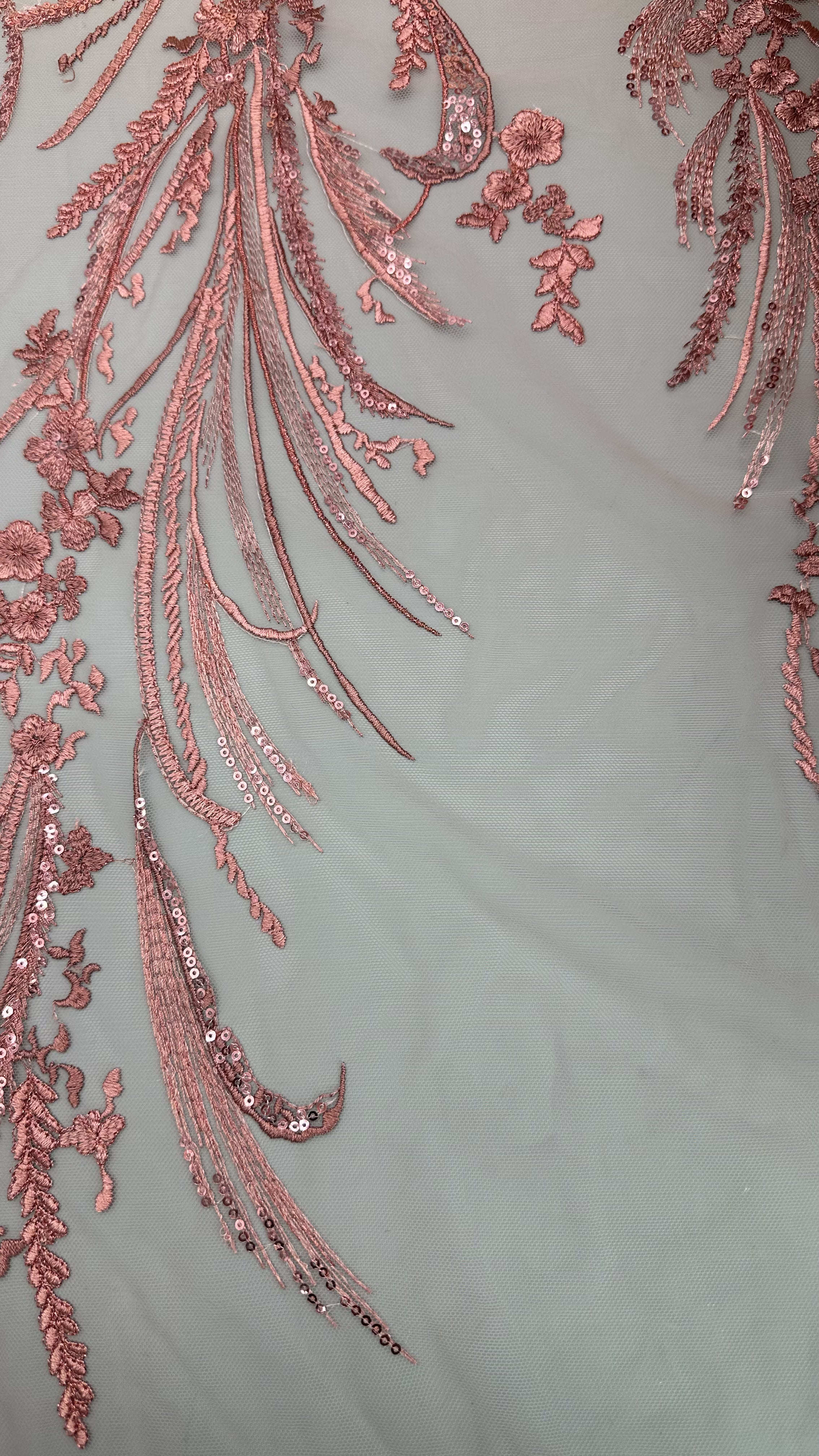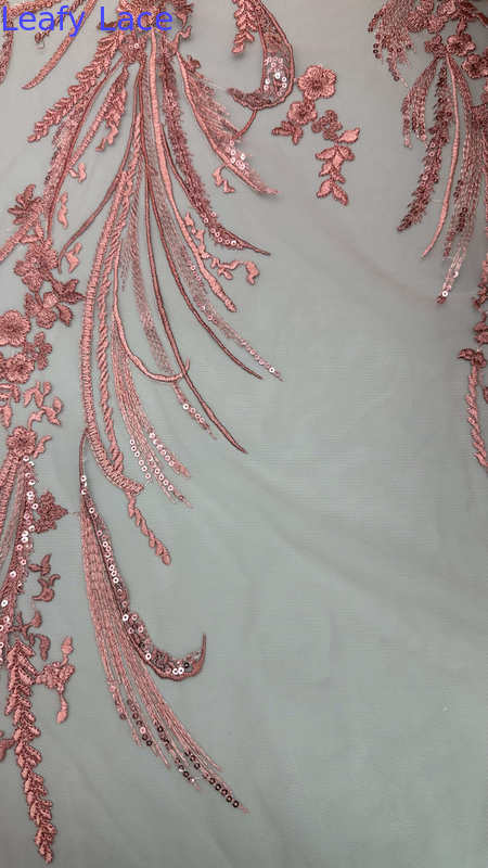 繊細な葉のモチーフが施されたレース刺繍生地は、結婚式やパーティーのドレスに人気があり、優雅さ、質感、複雑なディテールを提供します。その製造技術は、伝統的な職人技と最新のテキスタイル技術革新を融合させています。