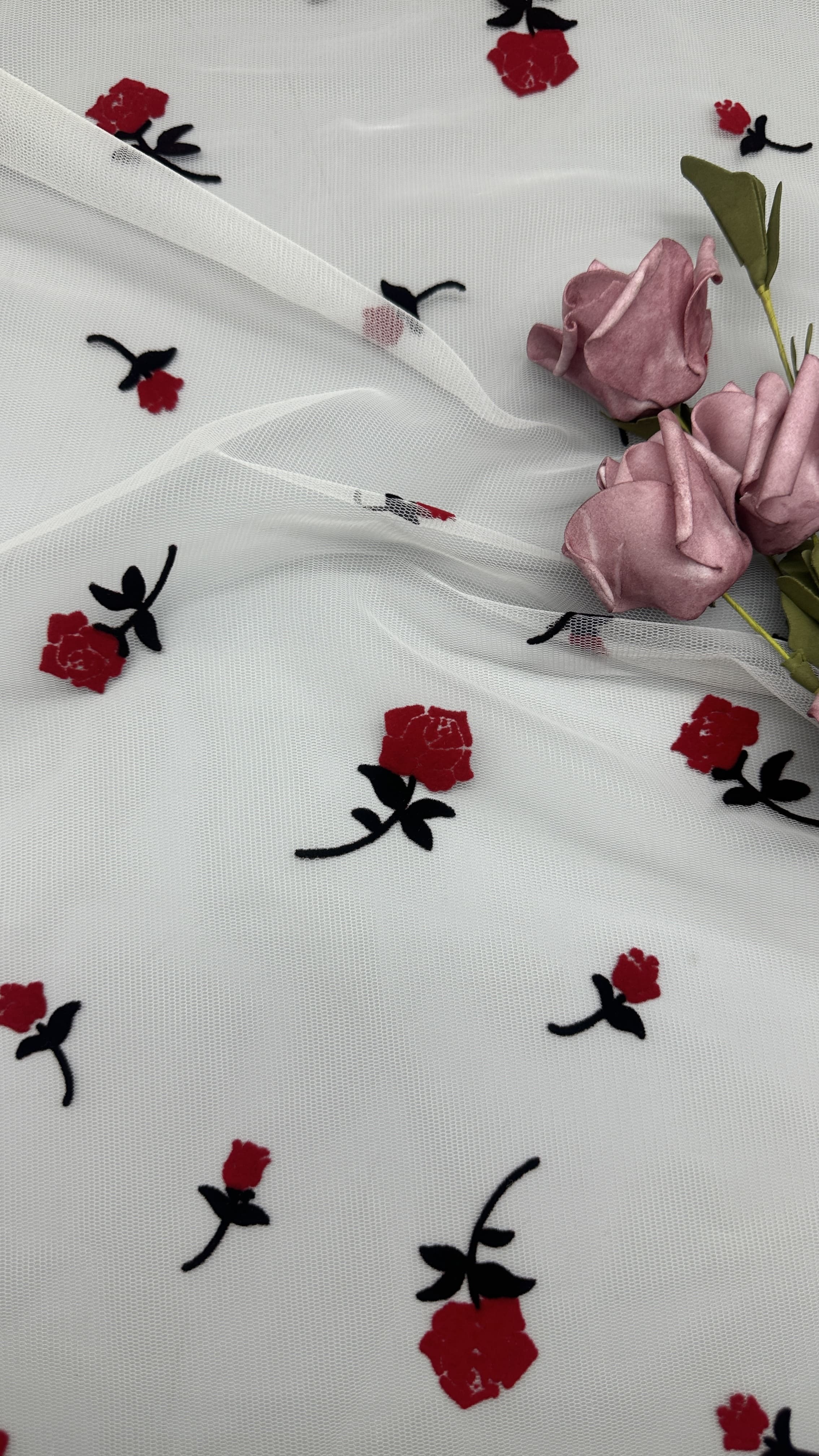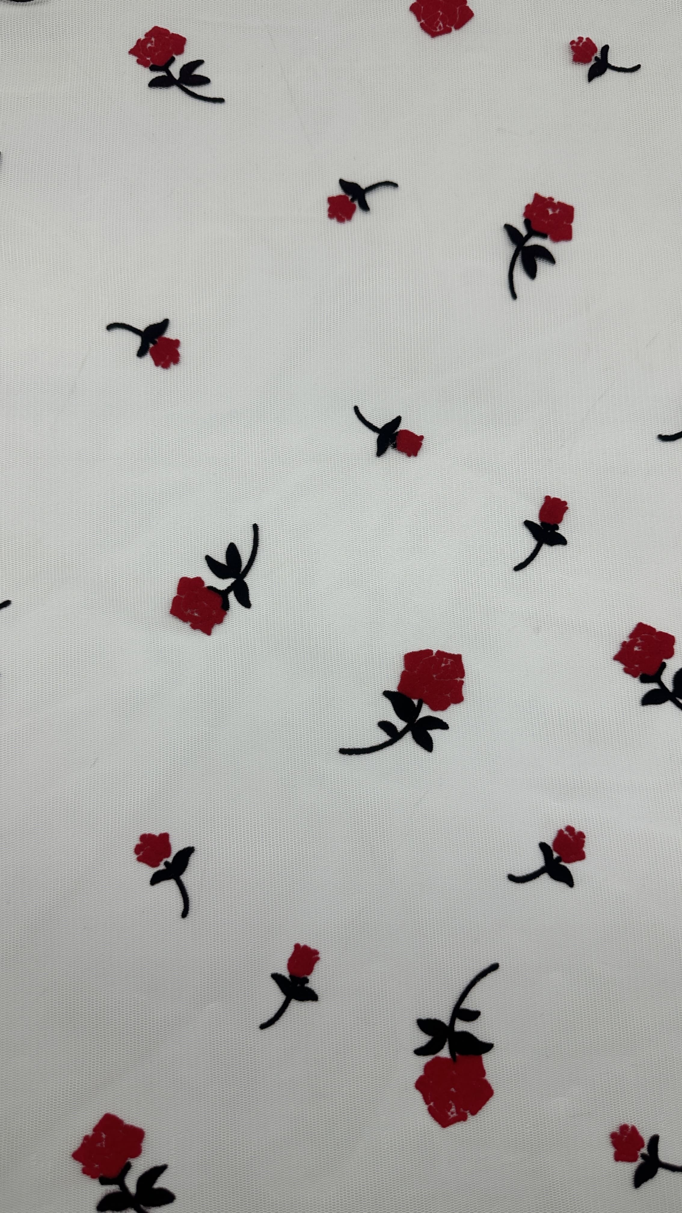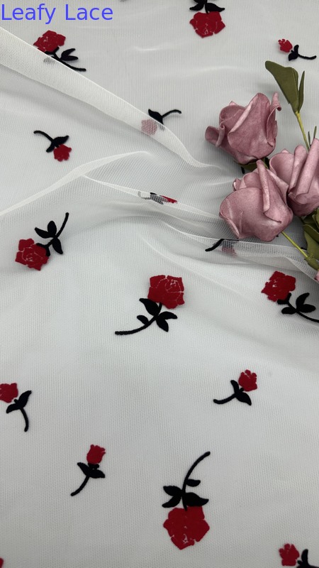 | ハイライト: | flocked mesh lace fabric,traditional rose lace fabric,elegant gown mesh fabric |