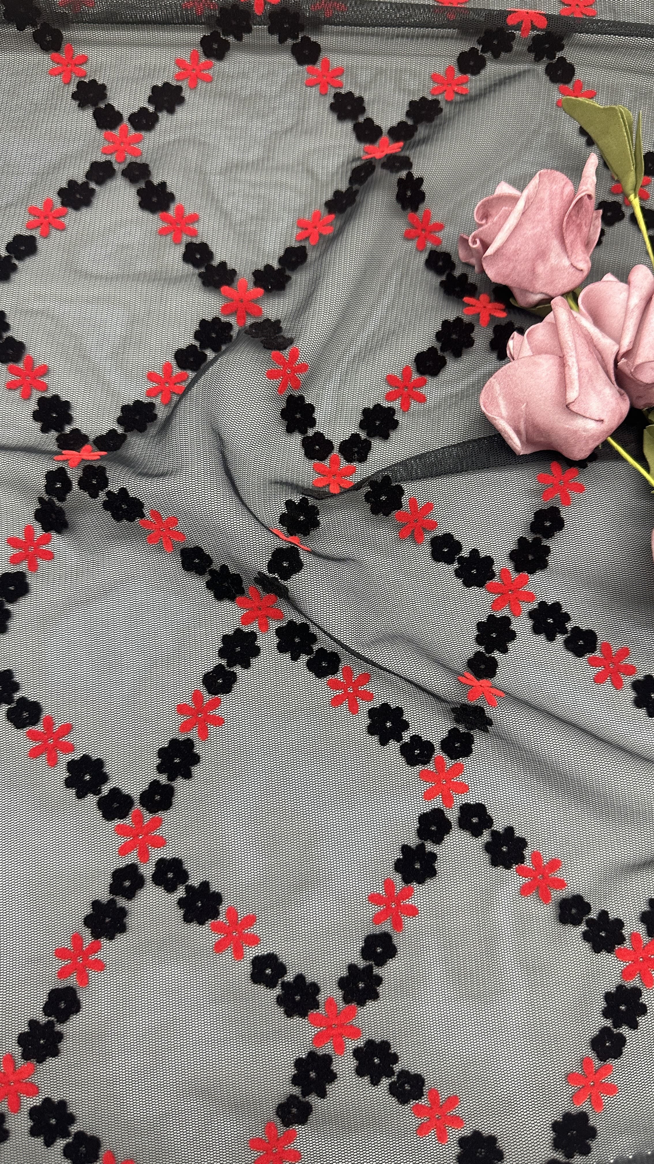 | ハイライト: | small flower flocked mesh fabric,rose black lace fabric,customized gown flocked mesh |